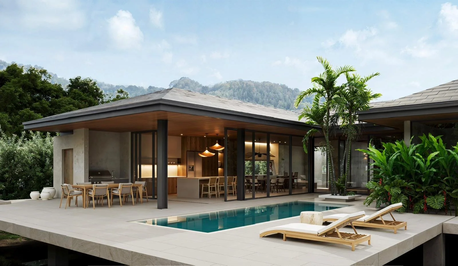 Intentional zoning was key to this build. Pourya created a soundproofed corridor that separates living spaces from the sleeping quarters, offering both privacy and peace. Each bedroom is freestanding and detached from the others, with a 4-meter garden space between them, ensuring natural light, airflow, and a feeling of openness. A large glass wall connects the interior living room with an expansive rancho hangout area, seamlessly blending indoor comfort with outdoor entertainment.