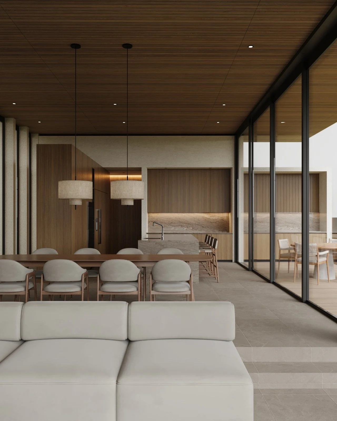 Building on a lot of a condominium comes with a very specific set of conditions. While the flat lot offers straightforward access, its position between two neighboring lots demanded a design that preserved privacy and unobstructed views for years to come. The terrain itself, sitting along a mountain curve, creates uneven levels that could be viewed as an obstacle but were instead turned into a defining element of the design. The challenge was to create a one-story residence that not only flowed with the existing nature but also capitalized on its elevated vantage point, bringing in natural light, maximizing mountain views, and fostering a seamless indoor-outdoor connection. Every detail—from curving the pool to mirror the mountain edge, to elevating the home in harmony with the terrain—was crafted to meet these challenges while creating something entirely unique.